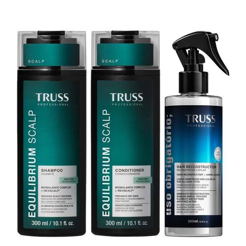 Truss Equilibrium Scalp Kit Shampoo Condicionador e Uso Obrigatório Reconstrutor 260ml Truss Equilibrium Scalp Kit Shampoo Condicionador e Uso Obrigatório Reconstrutor 260ml, reduz o desconforto no couro cabeludo e remove o excesso de oleosidade na raiz. Previne o ressecamento das pontas e hidrata os fios sem pesar. SHAMPOO EQUILIBRIUM SCALP Shampoo anticaspa com pH adaptado ao couro cabeludo, limpa profundamente, remove impurezas e controla a oleosidade. Sua fragrância fresca de Neroli, Bergamota e Flor de Laranjeira proporciona uma experiência sensorial revigorante. Limpeza profunda; Controle da oleosidade; Fragrância refrescante. Tecnologia Scalp Reboost. Como usar Aplique o shampoo sobre os cabelos molhados, massageie suavemente e enxágue. Repita a operação se necessário. CONDICIONADOR EQUILIBRIUM SCALP Condicionador que previne o ressecamento das pontas e hidrata os fios sem pesar. Com fragrância fresca de Neroli, Bergamota e Flor de Laranjeira, proporciona maciez e desembaraço. Hidratação intensa; Maciez e desembaraço; Fragrância refrescante. Tecnologia Scalp Reboost. Como usar Após o uso do shampoo, retire o excesso de água dos fios e distribua o condicionador no comprimento e pontas. Massageie, desembarace, deixe agir por 2 minutos e enxágue. Spray Uso Obrigatório Age como um tratamento instantâneo, desembaraçando, proporcionando força, condicionamento e maciez aos fios. Sua fórmula exclusiva, enriquecida com Nano Reconstruction e Aminoácidos, condiciona e reconstrói os fios, promovendo ultra desembaraço. Restaura a força e resistência dos fios recuperando a flexibilidade e elasticidade adequadas. Como usar Borrife o spray de 2 a 3 vezes, no comprimento e pontas mecha a mecha, após o shampoo e antes do condicionador ou máscara. Massageie e enxágue para ter o efeito condicionante. Também pode ser como leave-in finalizador borrifando de 2 a 3 vezes no comprimento e pontas. Marca: Não Informado Ean: 7895813874039