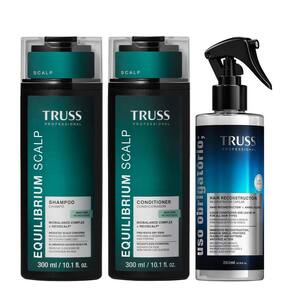 Truss Equilibrium Scalp Kit Shampoo Condicionador e Uso Obrigatório Reconstrutor 260ml Truss Equilibrium Scalp Kit Shampoo Condicionador e Uso Obrigatório Reconstrutor 260ml, reduz o desconforto no couro cabeludo e remove o excesso de oleosidade na raiz. Previne o ressecamento das pontas e hidrata os fios sem pesar. SHAMPOO EQUILIBRIUM SCALP Shampoo anticaspa com pH adaptado ao couro cabeludo, limpa profundamente, remove impurezas e controla a oleosidade. Sua fragrância fresca de Neroli, Bergamota e Flor de Laranjeira proporciona uma experiência sensorial revigorante. Limpeza profunda; Controle da oleosidade; Fragrância refrescante. Tecnologia Scalp Reboost. Como usar Aplique o shampoo sobre os cabelos molhados, massageie suavemente e enxágue. Repita a operação se necessário. CONDICIONADOR EQUILIBRIUM SCALP Condicionador que previne o ressecamento das pontas e hidrata os fios sem pesar. Com fragrância fresca de Neroli, Bergamota e Flor de Laranjeira, proporciona maciez e desembaraço. Hidratação intensa; Maciez e desembaraço; Fragrância refrescante. Tecnologia Scalp Reboost. Como usar Após o uso do shampoo, retire o excesso de água dos fios e distribua o condicionador no comprimento e pontas. Massageie, desembarace, deixe agir por 2 minutos e enxágue. Spray Uso Obrigatório Age como um tratamento instantâneo, desembaraçando, proporcionando força, condicionamento e maciez aos fios. Sua fórmula exclusiva, enriquecida com Nano Reconstruction e Aminoácidos, condiciona e reconstrói os fios, promovendo ultra desembaraço. Restaura a força e resistência dos fios recuperando a flexibilidade e elasticidade adequadas. Como usar Borrife o spray de 2 a 3 vezes, no comprimento e pontas mecha a mecha, após o shampoo e antes do condicionador ou máscara. Massageie e enxágue para ter o efeito condicionante. Também pode ser como leave-in finalizador borrifando de 2 a 3 vezes no comprimento e pontas. Marca: Não Informado