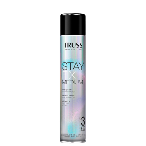 Spray fixador para média fixação. TRUSS Stay Fix Medium garante flexibilidade, modela e aumenta a resistência do penteado.