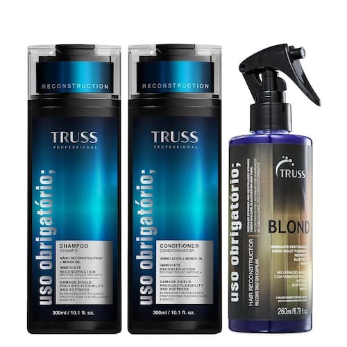 Contem: 1 unidade shampoo uso brigatorio 300ml 1 unidade condicionador uso obrigatorio 300ml 1 unidade truss uso obrigatorio blond tratamento reconstrutor 260ml Marca: Não Informado Ean: 7898670591255