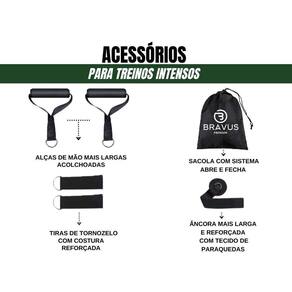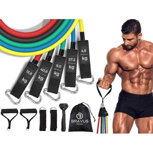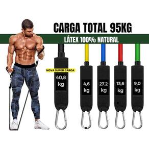 Tubing PREMIUM Extreme Carga Máxima Elástico Exercício Bravus Kit Tubing Premium Extreme - Carga Máxima 95 kg Acabamento Super Reforçado e Elásticos 100% Látex Natural Qualidade Premium O Kit Tubing Premium Extreme Bravus Sport foi feito para os usuários mais exigentes e que buscam um produto de alta resistência para superar todos os limites e levar seu treino para outro nível. Combine 5 elásticos de diferentes resistências e crie diversos níveis de carga de acordo ao seu perfil de treino O elástico tubing antipressão é feito de material de qualidade premium, 100% látex natural, o que gera uma resistência dupla. Os mosquetões de aço resistente e as tiras firmemente costuradas também evitam o rasgo, mesmo sob a extrema resistência ao estiramento. Treine em alta intensidade e sem preocupações, pois esse é um equipamento feito especialmente para você que é super exigente e focado em superar todos os limites O Kit Premium vem com 5 elásticos de borracha em forma de tubo duplamente reforçados, feitos de látex 100% Natural. Cada elástico tem 1,20 m de comprimento com garras em metal de alto calibre e que permitem um treino muito mais potente. É possível realizar os exercícios usando vários elásticos ao mesmo tempo, criando assim, mais de 50 níveis diferentes de resistência. O Kit Premium Bravus é tão completo que é possível fazer exercícios para trabalhar diversos grupos musculares tanto superiores, como: braços, peitoral e costas, quanto inferiores: glúteos, coxas, pernas e panturrilhas. O kit Inclui:1 elástico de 4.6 kg de resistência1 elástico de 9.0 kg de resistência1 elástico de 13.6 kg de resistência1 elástico de 27.2kg de resistência1 elástico de 40.8 kg de resistência2 alças de mão acolchoadas 2 tiras para tornozelo1 âncora para colocar na porta1 sacola de transporte