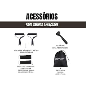 Tubing pro extreme elástico extensor carga 95kg Kit tubing extreme pro 95kg Chegou a hora de aumentar a carga do seu treino e ultrapassar todos os limites com o novo kit tubing extreme pro 95kg São 6 elásticos tubings com diferentes resistências totalizando 95 quilos de carga o novo tubing extreme bravus se adapta a diferentes níveis de treino, do nível iniciante com as cargas mais leves, entre 4,5kg e 9,1 kg até o nível avançado, com elásticos com cargas de 13,7, 18,2, 22,7 e 27kg A nova linha kit tubing extreme 95 kg bravus pro 12 peças vem com acabamento reforçado. O elástico tubing é conectado em um tecido de alta resistência, com marcação do peso correspondente em kg e ganchos largos Diferencial 1. Elástico tubing antipressão de látex de alta qualidade em degradê cinza 2. Mosquetões largos em aço resistente 3. Tiras em tecido reforçado com costura firme 4. Marcação do peso no tecido 5. 6 resistências diferentes, incluindo a nova carga de 27kg 6. Carga máxima de 95 quilos Cada elástico tem 1,20 m de comprimento com garras em metal. Todas as imagens do anúncio correspondem ao produto real. É possível realizar os exercícios usando 1 ou até 6 elásticos ao mesmo tempo, criando assim, mais de 40 níveis diferentes de resistência. O novo kit tubing extreme pro 95kg é tão completo que é possível fazer exercícios para trabalhar diversos grupos musculares - tanto superiores, como: braços, peitoral e costas, quanto inferiores: glúteos, coxas, pernas e panturrilhas. Finalidade: ganho de força, resistência, aumento de massa magra, tonificação muscular e melhora de condicionamento físico O kit inclui: 1 elástico cinza super claro de 4,5 kg de resistência 1 elástico cinza claro de 9,1 kg de resistência 1 elástico cinza médio de 13,7 kg de resistência 1 elástico cinza escuro de 18,2kg de resistência 1 elástico preto de 22,7 kg de resistência 1 elástico preto intenso de 27 kg de resistência 2 alças de mão revestidas de espuma 2 tiras para tornozelo 1 âncora para colocar na porta 1 bolsa em nylon