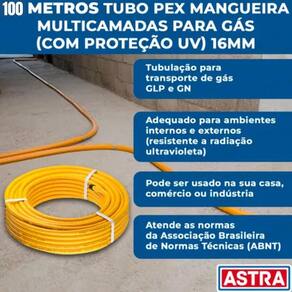 Tubo multicamada pex gas aluminio 16mm x 100mt astra prot uv Tubulação 16mm multicamada para condução de gases combustíveis formado por 5 camadas: pe - adesivo - alumínio - adesivo - pe. Produzido na cor amarela para melhor identificação, pode ser instalado embutido na parede resistente a cal, cimento, etc , maleável, reduzindo o número de conexões e reduz perda de carga. ========== O tubo pex multicamadas astra gás é a escolha ideal para instalações modernas de gás glp ou gn, garantindo segurança, durabilidade e eficiência. Este rolo com 20 metros de tubo amarelo com proteção uv atende às normas internacionais e brasileiras, sendo perfeito para projetos residenciais, comerciais e industriais. ========== Indicada para: Tubulação para transporte de gás glp e gn. Uso residencial. Temperatura e pressão máximas de 60c e 5 bar ========== Características: Resistência ao impacto. Resistência à corrosão química. Material leve: facilidade no transporte e montagem. Instalação limpa e segura por não utilizar materiais como vedantes e soldas. Redução de conexões, por ser maleável. Menos perda de material na obra por ser comercializado em bobinas com marcação metro a metro facilitando o corte. Sistema com proteção uv, possibilitando utilização exposta à luz solar. Diminuição dos casos de roubo por não se tratar de produto com mercado secundário. ========== Informações técnicas: Dilatação linear 2,3 x 10-5 k-1 Condutividade térmica r = 0,004 m2k/w Temperatura máxima de trabalho 60 c Pressão máxima de trabalho 5 bar a 60 c Rugosidade e = 0,007 mm Densidade 1,47 g/cm ========== do vendedor: 90 dias Marca: Não Informado