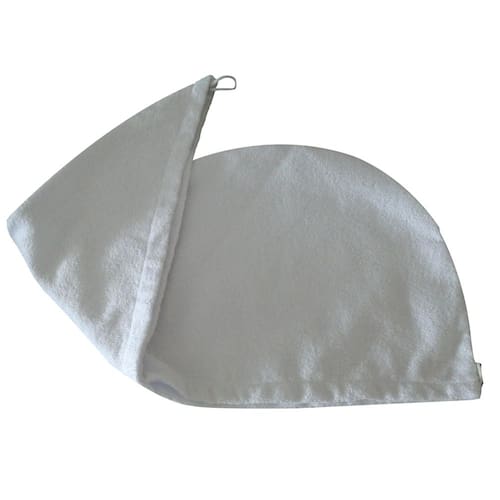 Turbante para secar o cabelo atoalhado branco , ele reduz pela metade o tempo de secagem do cabelo ao absorver a água e ajuda a diminuir o frizz, ótimo para segurar o cabelo e não deixar cair sobre o rosto ou roupa, já que conta com um fechamento em botão.