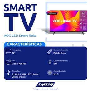 Tv 32p Aoc Led Smart Roku Wifi Hd Hdmi - 32s5155/78g Outras informações Imagem/display Tamanho da tela: 32 Processado / Engine de imagem: Quad core Tipo de painel: DLED Design: sem bordas Resolução do painel: HD 720p Frequência: 60 Hz Proporção de tela: 16:9 Ã&130;ngulo de visão: 178 Brilho: 200 cd/m Tempo de resposta: Homologação Anatel: 166292013501 Marca: Não Informado Ean: 7898620272838