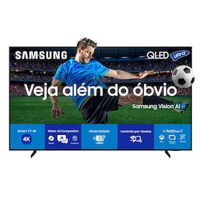 Smart TV QLED 4K com Quantum Dot, Processador IA Q4, Quantum HDR, Som em Movimento Virtual, Smart TV Tizen com 7 anos de atualização, Compatível com assistentes de voz, Gaming Hub, Multitela até 2 conteúdos, ALLM, Tela ultra wide e menu de jogo, Wi-Fi 5, Bluetooth 5.3, Design Slim com 3 bordas infinitas.Tamanho da tela