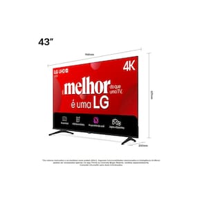 ESPECIFICAÇÕES TÉCNICAS Marca: LG Modelo: 43UA7500PSA Cor: Preto Polegadas: 43” Resolução: 4K Tamanho da tela: 43” Resolução: 4K UHD Taxa de atualização: 60 Hz Tipo de tela: LED Sistema inteligente: Sim Conectividade: Wi-Fi e Bluetooth Entradas: HDMI e USB Consumo em standby: inferior a 0,5 W Dimensões do Produto (AxLxP): 6.8 x 56.0 x 96.0 cm Dimensões da Embalagem (AxLxP): 8.0 x 58.0 98.0 cm Peso Líquido: 7.0 Kg Peso Bruto: 9.0 Kg Garantia: 12 Meses