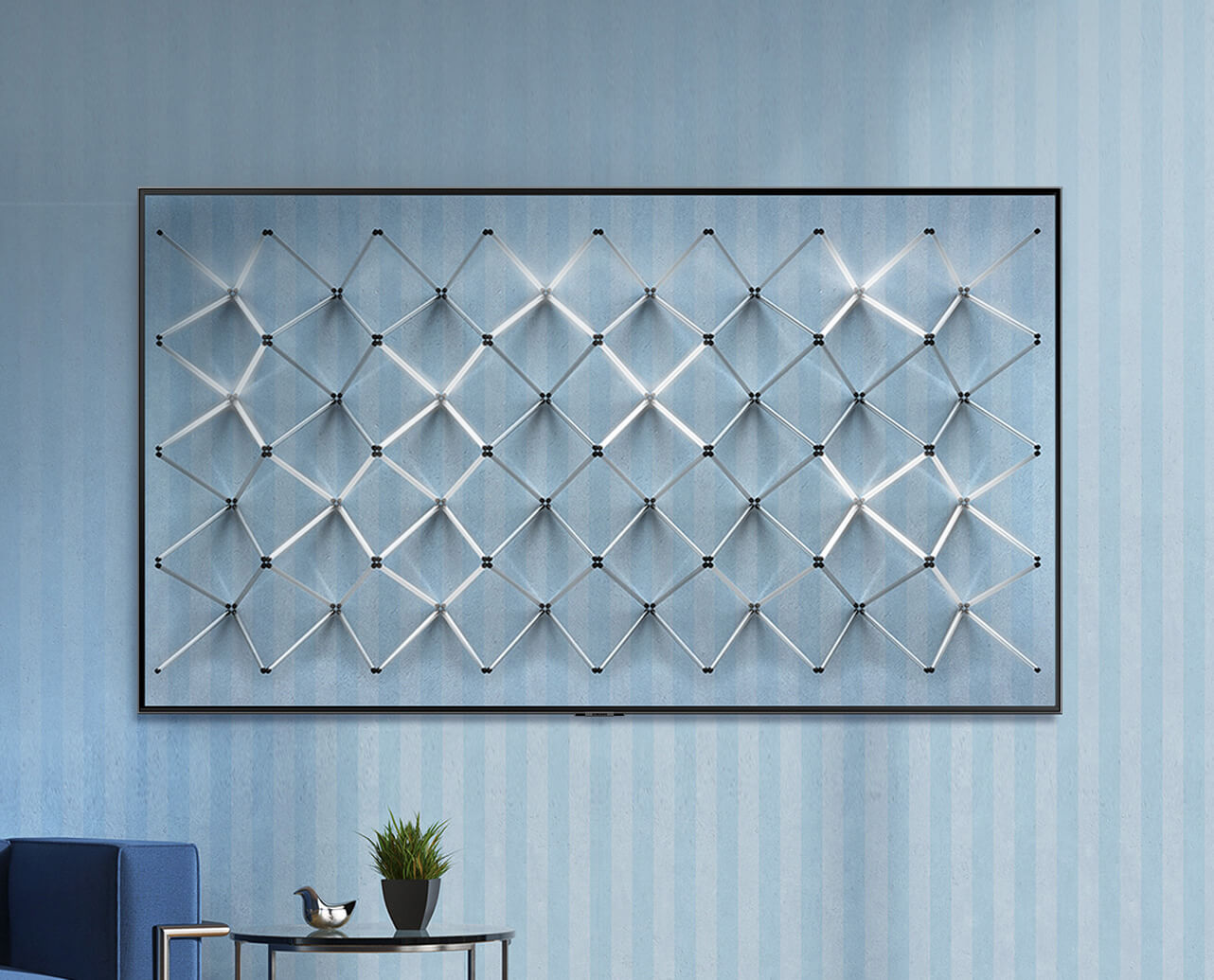 Ao invés de uma tela preta, ative o exclusivo Modo Ambiente 3.0 e combine a QLED com o seu espaço. Selecione uma das texturas pré-definidas na TV, ou tire uma foto da QLED já na parede para que ela se adeque à sua sala.7