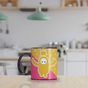 Liberte os feijões com as novas canecas de calor Fall guys Color change. Veja como você caneca ganha vida quando a água quente. O contorno do personagem Bean na caneca preta se transforma em um feijão colorido com a caneca mudando para cores amarelas da equipe.