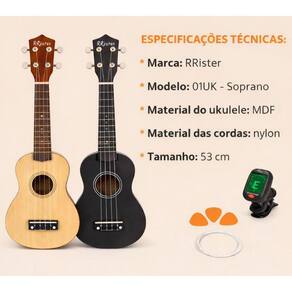 Ukulele acústico soprano capa 3 paletas + afinador A rrister resolveu trazer para o mercado brasileiro seu ukulele pois sabe que o brasileiro é apaixonado por música, e tem paixão pela arte, incentivando novos músicos a despertar seu talento. Nosso ukulele é ideal para iniciar neste universo maravilhoso da música. Construído com alta qualidade e excelência de quem respira a música, o acabamento brilhante de fácil ajuste e adaptação fazem o ukulele rrister a escolha correta. Instrumento feito de madeira e com cravelhas reforçadas, já acompanha cordas, capa protetora e palhetas. Palavras-chave: instrumentos musicais, instrumento, instrumento musical, ukulele soprano, preço ukulele, kulele Especificações técnicas: Marca: rrister Modelo: 01uk - soprano Material do ukulele: mdf Material das cordas: nylon Tamanho: 53cm Itens inclusos: 1 ukulele 1 afinador 1 capa 3 palhetas 4 cordas de 3 meses contra quaisquer defeitos de fabricação e transporte. A não contempla problemas por mau uso do produto. Marca: Não Informado