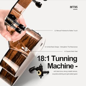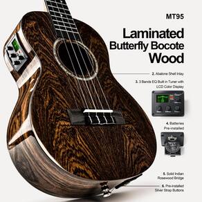 Ukulele elétrico e acústico tenor brilhante Butterfly Bocote - Apelo visual impressionante: o bocote apresenta padrões de grãos impressionantes e tons dourados vibrantes, tornando cada peça única. Suas belas variações naturais não apenas melhoram a estética do instrumento, mas também adicionam calor e profundidade ao som geral, garantindo que cada nota ressoe com personalidade. - Artesanato genuíno feito à mão: ao contrário de muitas outras marcas que dependem da produção de fábrica, a Caramel Ukulele se orgulha de sua construção autêntica feita à mão. Cada ukulele é meticulosamente trabalhado por sua equipe qualificada, com o mínimo de uso de máquinas. Esta abordagem prática garante qualidade superior e atenção aos detalhes. - Acabamento brilhante requintado: TEG95 apresenta um acabamento brilhante exclusivo que os diferencia dos ukuleles padrão. Semelhante ao processo meticuloso utilizado para acabamentos de laca de piano, cada ukulele passa por várias rodadas de polimento cuidadoso. O resultado é uma aparência deslumbrante, durável e brilhante que chama a atenção. - Cordas de fibra de carbono para desempenho excepcional: as cordas de ukulele especialmente projetadas da Caramel foram amplamente testadas e são conhecidas por sua excelente jogabilidade e tom claro. Estas cordas de fibra de carbono proporcionam uma experiência de toque confortável enquanto produzem uma qualidade de som rica e ressonante, tornando-as perfeitas para músicos iniciantes e experientes. - Máquina de afinação premium para desempenho confiável: os ukuleles Caramel se destacam com suas máquinas de afinação de alta qualidade. Geralmente encontrados em instrumentos artesanais de alto preço, esses afinadores apresentam um tom preto elegante, textura metálica forte e polimento requintado. Com uma relação de engrenagem 18: 1 atualizada, esses sintonizadores oferecem ajuste preciso e confiável, garantindo que seu ukulele permaneça perfeitamente afinado.