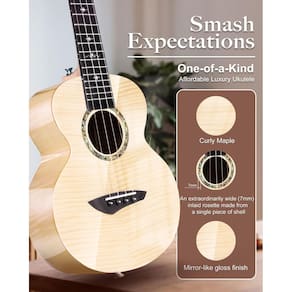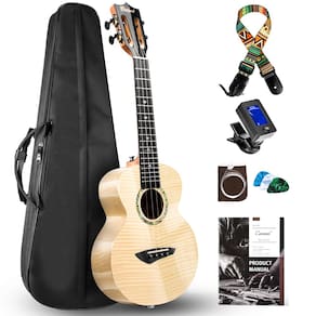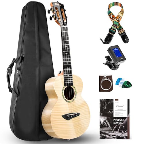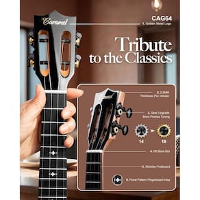 Caramel Ukulele de concerto CAG64 de bordo encaracolado branco brilhante de 58 cm para iniciantes | Kit de iniciante Ukelele artesanal - Artesanato genuíno feito à mão: ao contrário de muitas outras marcas que dependem da produção de fábrica, a Caramel Ukulele se orgulha de sua construção autêntica feita à mão. Cada ukulele é meticulosamente trabalhado por sua equipe qualificada, com o mínimo de uso de máquinas. Esta abordagem prática garante qualidade superior e atenção aos detalhes. - Acabamento brilhante requintado: CAG64 apresenta um acabamento brilhante exclusivo que os diferencia dos ukuleles padrão. Semelhante ao processo meticuloso utilizado para acabamentos de laca de piano, cada ukulele passa por várias rodadas de polimento cuidadoso. O resultado é uma aparência deslumbrante, durável e brilhante que chama a atenção. - Cordas de fibra de carbono para desempenho excepcional: as cordas de ukulele especialmente projetadas da Caramel foram amplamente testadas e são conhecidas por sua excelente jogabilidade e tom claro. Estas cordas de fibra de carbono proporcionam uma experiência de toque confortável enquanto produzem uma qualidade de som rica e ressonante, tornando-as perfeitas para músicos iniciantes e experientes. - Máquina de afinação premium para desempenho confiável: os ukuleles Caramel se destacam com suas máquinas de afinação de alta qualidade. Geralmente encontrados em instrumentos artesanais de alto preço, esses afinadores apresentam um tom preto elegante, textura metálica forte e polimento requintado. Com uma relação de engrenagem 18: 1 atualizada, esses sintonizadores oferecem ajuste preciso e confiável, garantindo que seu ukulele permaneça perfeitamente afinado. - Kit completo de acessórios incluído: o Ukulele Caramel vem com um kit de acessórios abrangente, fornecendo tudo o que um iniciante precisa para começar a tocar imediatamente. O kit inclui uma bolsa de transporte conveniente para facilitar o transporte, um sintonizador para afinação precisa, um pano de limpeza para manter seu ukulele impecável e palhetas para diferentes estilos de jogo. Este kit com tudo incluído poupa o incômodo de comprar acessórios adicionais separadamente.