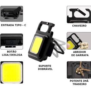 Características: + Potência de até 800 lúmens + Iluminação de 360 graus + 3 modos de luz: alto, baixo e estroboscópico + Recarregável por USB cabos inclusos + Indicador de carga vermelho = carregando / verde = carregada + Resistente à água e impactos + Ímã forte embutido + Alça dobrável em 180 + mosquetão integrado + Função extra: abridor de garrafas