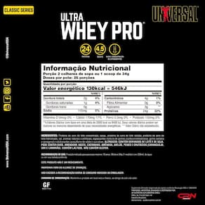 O Ultra Whey Pro da Universal Nutrition contém em sua fórmula três tipos de proteínas de alto valor biológico, a Proteína Isolada (WPI), Proteína Concentrada (WPC) e Proteína Hidrolisada (WPH) contendo 24g de proteína, e 4g de carboidrato, além de várias outras vitaminas e minerais.