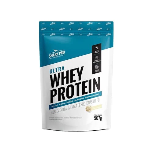 Ultra Whey Protein Sabor Chocolate Branco Refil 907g Shark Pro O Ultra Whey Protein Sabor Chocolate Branco, em embalagem refil de 907g, da Shark Pro, é um suplemento alimentar em pó ideal para quem busca uma forma prática e saborosa de adicionar proteínas de alta qualidade à dieta diária. Este produto é formulado com whey protein concentrado, uma das formas mais populares de proteína derivada do soro do leite.