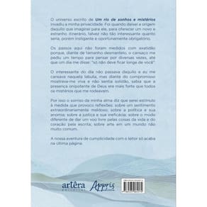 O universo escrito de Um rio de sonhos e mistérios invadiu a minha privacidade. Foi quando deixei a origem daquilo que imaginei para ele, para oferecer um novo e estranho itinerário, talvez não tão interessante quanto seria, porém instigante e oportunamente obrigatório. Os passos aqui não foram medidos com exatidão porque, diante de tamanho desmantelo, o cansaço me pediu um tempo para pensar por diversas vezes, até que um dia me disse: “só não deve ficar longe de você”. O interessante do dia não passava daquilo e eu me cansava naquela labuta, mas diante do compromisso mostrava-me viva e não sentia solidão, sabia que a presença onipotente de Deus era mais forte que todos os mistérios que me rodeavam. Por isso o sorriso da minha alma diz que serei estímulo à medida que provoco reflexões: sobre um sentimento extraordinariamente maldoso; sobre a política e sua anomia; sobre a justiça e sua ineficácia; sobre o modo diferente de dar um voo livre pelas coisas da vida e do coração pela escrita; sobre arte em um mundo não muito comum. A nossa aventura de cumplicidade com o leitor só acaba na última página. Marca: ARTERA EDITORA