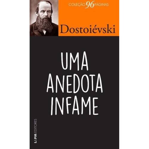 Ivan Ilítch Pralínski, general e alto funcionário público, tem fama de liberal. Bonito e requintado, um poeta na alma, anda com uma condecoração no pescoço e sonha em ser estadista. Ao sair de um jantar, passa ao acaso na frente da festa do casamento de um de seus subalternos mais humildes e vê aí uma oportunidade: dar a honra de sua bondosa presença ao pobre Pseldonímov. Mas nada sai como planejado, e sua deferente visita se transforma numa espiral de constrangimento. Dostoiévski publicou Uma anedota infame primeiramente em capítulos em 1862 na revista Tempo, que mantinha com o irmão. No mesmo ano em que publicava Memórias da casa dos mortos, construiu esta afiada sátira sobre a luta de classes da Rússia do século XIX, um de seus temas mais caros. Ao contrário dos sombrios dramas que marcaram sua literatura, esta novela está carregada de uma falsa leveza. Sarcasticamente revela a visão de mundo de Dostoiévski: o ser humano apoia seu semelhante ao mesmo tempo em que o esmaga cruelmente.