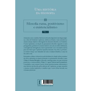 Aclamada como a melhor história da filosofia disponível em língua inglesa, a obra de Frederick Copleston, inédita no Brasil, é uma narrativa ao mesmo tempo objetiva e abrangente do itinerário filosófico no Ocidente. O autor apresenta a evolução do pensamento filosófico segundo os seus protagonistas, partindo do contexto histórico de cada um deles. Influências, convergências e divergências, tudo é apresentado com a necessária clareza para um leitor que Copleston supunha iniciante. Sua obra é, portanto, ao mesmo tempo um vislumbre de toda a tradição filosófica e uma via de acesso a ela. Este quinto e último volume da versão brasileira da coleção reúne os ensaios do autor referentes ao desenvolvimento do pensamento filosófico russo (Volume 10: Russian Philosophy) e à filosofia contemporânea, em suas vertentes positivista e existencialista (Volume 11: Logical Positivism and Existentialism). Concebidos como ensaios à parte, foram posteriormente adicionados a esta história da filosofia pelos editores de Copleston, porque mantêm o mesmo caráter explicativo e analítico que o autor havia adotado nos volumes anteriores.