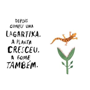 Conheça uma planta com uma fome sem fim, que fica maior a cada página — e a cada refeição! Num certo dia de sol, uma planta carnívora nasceu. Ela era pequena e delicada, e estava com muita fome. Então passou a engolir todo tipo de criatura: lagarta, borboleta, coelho, vaca paraquedista, mamute voador… Quanto mais a planta comia, maior ficava, e nada nem ninguém parecia capaz de detê-la. Será mesmo? Neste livro ilustrado, o artista Renato Moriconi cria uma planta tão cheia de fome quanto a lagarta de Eric Carle, com uma narrativa visual que vai fisgar os pequenos leitores. Este livro é indicado para crianças a partir de 4 anos.