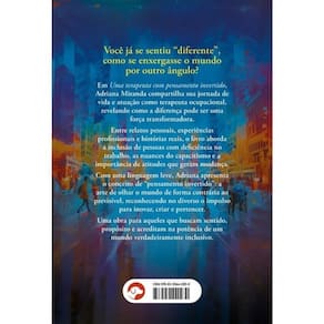 Você já se sentiu “diferente”, como se enxergasse o mundo por outro ângulo? Em Uma terapeuta com pensamento invertido , Adriana Miranda compartilha sua jornada de vida e atuação como terapeuta ocupacional, revelando como a diferença pode ser uma força transformadora. Entre relatos pessoais, experiências profissionais e histórias reais, o livro aborda a inclusão de pessoas com deficiência no trabalho, as nuances do capacitismo e a importância de atitudes que geram mudança. Com uma linguagem leve, Adriana apresenta o conceito de “pensamento invertido”: a arte de olhar o mundo de forma contrária ao previsível, reconhecendo no diverso o impulso para inovar, criar e pertencer. Uma obra para aqueles que buscam sentido, propósito e acreditam na potência de um mundo verdadeiramente inclusivo.
