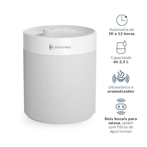 - Marca: Dellamed - Modelo: Umi LIGHT - Capacidade: 2,3 L - Autonomia: 10–12 h contínuas - Volume de névoa: 50–150 ml/h - Área recomendada: até 20 m² - Dimensões: 19 × 16 cm - Cabo: 120 cm (USB-C) - Alimentação: DC5V/3W — Bivolt (127–240V) - Garantia: 12 meses diretamente com fornecedor