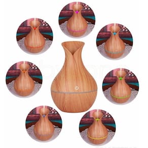 CARACTERÍSTICAS: Lindo aromatizador e umidificador de ar, com led, que alterna automaticamente em 7 cores no mesmo aparelho, com capacidade para 130ml de água. Sua composição é em plástico imitando madeira. Dura até 4 horas ligado direto, com desligamento automático quando a água acabar. Pode ser adicionado algumas gotas de essência liquida na água para perfumar o ambiente.