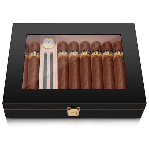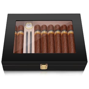 Desfrute de armazenar seus charutos cubanos em perfeitas condições com o Humidor de Charutos Bald Eagle. Feito com madeira de cedro espanhol de alta qualidade, este humidor combina artesanato detalhado com design luxuoso. Com capacidade para até 10-15 charutos, possui um acabamento em preto brilhante, hygrometer e humidificador de alto nível. Além disso, vem com uma gaveta de madeira, conta-gotas e divisória removível. Um presente de luxo para apreciadores de charutos, perfeito para casa, escritório ou bar. Tamanho externo: 23,8 x 18,3 x 5,1 centímetros, Tamanho interno: 21,1 x 15,7 x 3,3 centímetros.