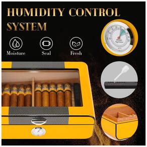 A Caixa de Cedro de alta qualidade da marca Bald Eagle atua como um regulador de umidade natural, absorvendo e liberando umidade para manter níveis ideais. Seu aroma único ajuda a proteger e realçar o sabor do seu charuto precioso. O sistema de umidificação conta com um higrômetro que detecta mudanças de umidade a tempo. Em caso de leitura abaixo de 65, basta adicionar 25 gotas de água destilada ou solução de PG ao humidificador e aguardar por 12 dias. O revestimento de cedro e as guarnições de borracha ao redor do higrômetro proporcionam um fechamento hermético, evitando efetivamente a perda de umidade. O design único, com acabamento de alto brilho, pintura amarela e fibra de carbono, cria uma decoração luxuosa para seus charutos. A tampa de vidro permite visualizar facilmente seu estoque de charutos e condições. Além disso, o serviço de embalagem premium oferece proteção completa, tornando-a um presente perfeito para os amantes de charutos. O serviço de pós-venda amigável está sempre disponível para ajudar com quaisquer questões.