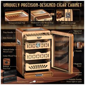 Design de Armazenamento com 5 Camadas: O umidor possui 4 bandejas de madeira de cedro com diferentes capacidades. A bandeja superior tem um design vazado e comporta até 9 charutos. Combinada com as 3 bandejas de cedro vazadas inferiores, é possível armazenar aproximadamente 100-150 charutos (a capacidade real pode variar conforme o calibre do anel). A parte inferior do gabinete possui uma gaveta com alça retrátil para armazenar facilmente seu isqueiro de charuto, cortador, perfurador e outros acessórios ou colecionáveis. O design flexível permite personalizar o espaço de armazenamento sem esforço, garantindo que sua coleção esteja sempre organizada.