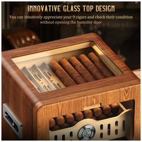 Cabinete umidor com Tampa e Porta de Vidro Transparente: Este umidor de charutos apresenta um design com tampa de vidro temperado e porta de vidro, permitindo visualizar os charutos sem precisar abrir o gabinete. A tampa de vidro facilita o monitoramento da condição dos charutos, garantindo umidade ideal. O umidor LIHTUN combina elegância e funcionalidade, oferecendo uma bela exibição para sua coleção de charutos, ao mesmo tempo em que simplifica a manutenção diária, tornando-se uma escolha perfeita para um estilo de vida sofisticado.