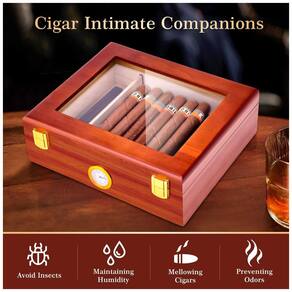 Controle preciso da umidade: os charutos requerem alta umidade. Nossa caixa de humidor de charutos possui um sistema de umidificação com um umidificador embutido e um higrômetro preciso que mantém a umidade interna do humidor para charutos em 65-75%. Nesse ambiente, o tabaco do charuto fica devidamente hidratado, mantendo seu sabor encorpado, sendo uma ferramenta de preservação de charutos. Material premium: a temperatura e o material das caixas de charuto possuem grande impacto na preservação dos charutos. Nosso estojo de humidor de charutos é feito à mão de cedro espanhol, com propriedades umidificantes e isolantes. Permite que os charutos envelheçam em um ambiente adequado, resultando em melhor sabor, aroma e qualidade. A caixa de charutos possui um divisor removível de cedro, permitindo organizar os charutos de tamanhos comuns de forma estável. Sua excelente vedação: os sabores dos charutos são altamente suscetíveis a odores. Nosso humidor de mesa é feito de cedro espanhol e possui excelente desempenho de vedação, com bordas de vedação embutidas e um umidificador de charutos bem ajustado que mantém a umidade e a frescura dos charutos. Isso permite que o charuto mantenha seu aroma e sabor autêntico, proporcionando uma experiência de fumar autêntica. Artesanato requintado: a superfície do humidor de charutos é feita de laca de cozimento, simples e requintada, resistente ao desgaste e polida. O fundo de veludo resistente a riscos evita arranhões na caixa de armazenamento de charutos. A dobradiça dourada é suave, e o fecho dourado adiciona um toque de luxo ao umidor. A grande janela de vidro na parte superior combina praticidade e estética. A aparência geral é requintada, ideal para caixas de charutos para homens. Cultura: os charutos carregam uma cultura profunda. O conjunto de caixa de umidor de charutos apresenta um estilo clássico e rústico, com grão de madeira de nogueira vermelha clássica e artesanato puro. Nossa caixa de charutos personalizada é uma homenagem a essa cultura. Ao abrir a tampa do pequeno umidor de charutos, os charutos organizados parecem contar uma história. Cada vez que você pega um charuto, você se vê imerso no ritual. A atenção aos detalhes da caixa de charutos melhora o prazer de degustar e a elegância de compartilhar.