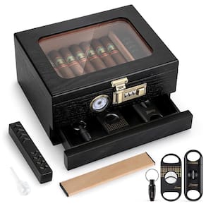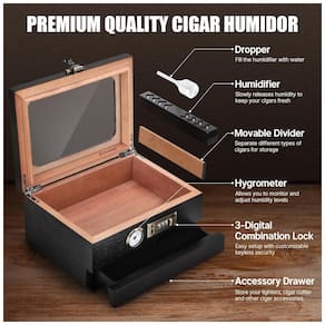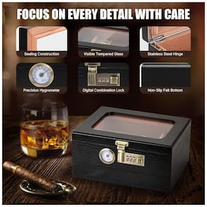 Construção de Qualidade Este humidor de charutos é artesanalmente feito de cedro e cuidadosamente polido para proporcionar uma sensação suave e resistente. Seu interior possui uma dobradiça de aço inoxidável prateado, que se abre flexivelmente a 90 graus para garantir uma boa vedação. A parte superior é de vidro temperado visual, permitindo exibir seus charutos preciosos sem precisar abrir a tampa. Sistema de Humidificação Perfeito Apresenta um higrômetro de bronze preciso que verifica a umidade dentro do humidor em tempo real. O umidificador de charutos libera lentamente a umidade para garantir que o interior da caixa de charutos esteja adequadamente umedecido. É recomendado manter a umidade interna entre 65 e 75 para manter seus charutos frescos por muito tempo. Design de Dupla Proteção Cada umidor de charutos possui um dispositivo de fechadura digital de combinação fácil de usar para armazenamento seguro dos seus charutos. O fundo da caixa também possui um material macio de feltro, resistente a arranhões, que protege não só a mesa de danos por atrito, mas também permite ao umidor manter uma aderência e colocação estáveis, deixando seus charutos em um ambiente seguro com proteção dupla. Capacidade e Armazenamento de Acessórios Este sofisticado estojo de charutos pode acomodar de 20 a 35 charutos, dependendo do tamanho. O umidor possui uma gaveta deslizante na parte inferior para armazenar facilmente seu isqueiro, furador de charutos, cortador de charutos e outros acessórios. Este umidor é o kit de armazenamento de charutos ideal para amantes de charutos. Presente de Feriado de Escolha Precisa de um presente único para surpreender o amante de charutos em sua vida? Este umidor de charutos em cedro artesanal é elegante e funcional, sendo uma ótima opção para presentes de feriado como Dia dos Namorados, aniversários, Dia dos Pais, aniversários, Natal e muito mais. É o umidor pessoal perfeito tanto para iniciantes quanto para amantes profissionais de charutos.