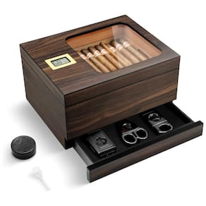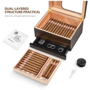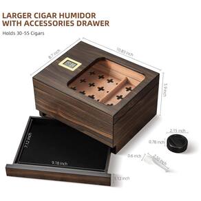 O umidor de Charutos da OTAKOKIT, feito de cedro natural, destaca-se pelo design moderno com tampo de vidro temperado, permitindo visualizar os charutos e monitorar a umidade em tempo real. Com vedação hermética excelente e hygrometer digital, mantém os charutos frescos por mais tempo. Possui amplo espaço de armazenamento para 30-55 charutos, divisores de cedro removíveis, bandeja extra e gaveta para acessórios. Ideal para presentear amantes de charutos!