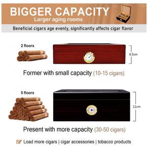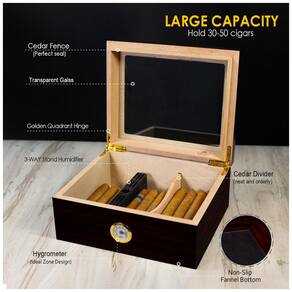 Mantenha seus charutos sempre frescos e protegidos com a nossa caixa umidor de charutos com tampa de vidro! Interior em madeira de Cedro Espanhol e divisória preservam o sabor e aroma ricos. Sua construção selada mantém os charutos mais frescos por mais tempo. O higrômetro frontal permite que você verifique os níveis de umidade a qualquer momento. Umidificador 3 em 1 atualizado feito de plástico ABS com contas embutidas. Uma carga pode durar de 5 a 6 semanas, criando o nível ideal de umidade para seus charutos. Precisa de um presente para alegrar o dia de alguém? Nossa caixa umidor de charutos é o presente perfeito de aniversário, aniversário, Natal ou Dia de Ação de Graças para qualquer apreciador de charutos. Com acabamento em ébano artesanal, dobradiças douradas brilhantes e design simples e bonito, este umidor de charutos personalizado em Cedro Espanhol certamente impressionará seus convidados. Durável e resistente, com vidro temperado resistente a marcas ou quebras acidentais, e base de veludo antiderrapante.