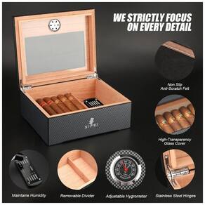 O umidor de charutos XIFEI apresenta um design de fibra de carbono na superfície, acabamento brilhante e trabalho requintado. O interior é revestido com madeira de cedro espanhol e forro de madeira sólida, proporcionando resistência à umidade e à pressão dos charutos. A janela de vidro no topo permite observar os charutos a qualquer momento. Com capacidade para 25-60 charutos, a capacidade de armazenamento depende do calibre e do tamanho dos charutos. Possui higrômetro ajustável embutido para monitorar e ajustar facilmente a umidade. Acompanha solução de umidificação, um cortador de charutos durável, um suporte de acrílico e um cinzeiro dedicado. Um conjunto de presente perfeito com design elegante, ideal para homens em diversas ocasiões. Valorizamos a experiência de cada cliente.