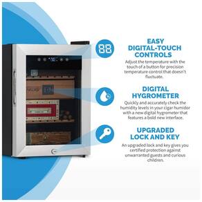 Resfrie seus Charutos Perfeitamente: Com nosso novo painel de controle digital sensível ao toque, você pode resfriar sua coleção de charutos até 11°C (52°F). Use os botões digitais de fácil acesso para controlar a temperatura interna do umidor.