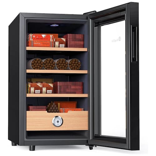 Aproveite o controle preciso de temperatura do Humidor KingChii, que utiliza tecnologia eletrônica de semicondutores para manter um ambiente estável e silencioso. Com circulação de ar de 360 graus, o armário garante a temperatura e umidade ideais para o armazenamento de charutos. O cedro espanhol de alta qualidade presente nas prateleiras emite um aroma natural que mantém a umidade, evita odores indesejados e previne o ressecamento e mofo dos charutos. Além disso, a porta de vidro temperado de alta resistência e painel touch screen oferecem um toque de elegância a este presente de luxo, ideal para qualquer ambiente.
