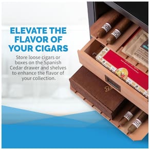 Prateleiras de Cedro Espanhol para Melhor Sabor: Armazene os charutos na gaveta de cedro espanhol de alta qualidade ou coloque as caixas de charutos nas prateleiras ventiladas de cedro espanhol. O cedro espanhol melhora o sabor dos charutos e ajuda a manter a umidade ideal dentro do umidor.
