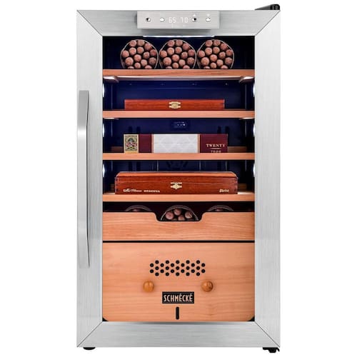 APROVEITE SABOR SUAVE, QUEIMA E DESENHO Preserve o sabor distinto, aroma e aparência de sua coleção com vários recursos projetados especificamente para a longevidade e integridade do charuto. Isso inclui portas de vidro fumê para bloquear os raios UV prejudiciais, prateleiras e gavetas de cedro espanhol para manter o sabor e prevenir besouros, além de uma vedação hermética reforçada e isolamento sólido de espuma de poliuretano.