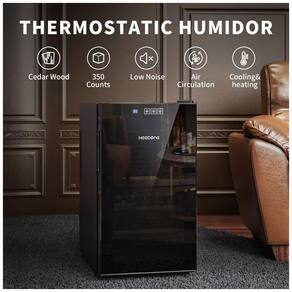 O umidor NEEDONE 48L é um armário refrigerado elétrico que oferece funções de resfriamento e aquecimento, sendo perfeito para ser utilizado em qualquer estação do ano. Utilizando a Tecnologia SemiHeat com chips semicondutores, mantém o clima interno preciso e constante, com níveis de ruído inferiores a 38dB, proporcionando um funcionamento ultra silencioso. Feito de cedro espanhol, o humidor promove o envelhecimento, melhora o aroma e preserva o sabor dos charutos armazenados. Com capacidade para até 350 charutos, as prateleiras e gaveta de cedro estão impregnadas com um aroma natural agradável. A porta de vidro duplo, com controle ao toque, isola raios ultravioleta e retém o calor de forma eficaz. Além disso, o sistema de resfriamento de ar de circulação 360° evita a formação de gelo e garante que a umidade seja uniformemente distribuída em todas as camadas do armário. Um presente elegante e funcional para os amantes de charutos.