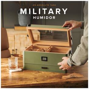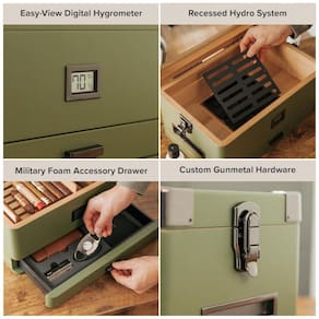 APROVADO POR AFICIONADO Construído em madeira grossa e incrustado em cedro espanhol, este humidor é o verdadeiro negócio. Inspirado em baús militares, o exterior apresenta uma cor verde militar fosca e componentes personalizados de metal polido, incluindo os protetores de canto, travas laterais da tampa, alças e higrômetro digital frontal. O interior possui um sistema de umidificação embutido e uma bandeja de zenamento removível que pode ser deslizada. Não é mais necessário remover a bandeja superior para alcançar os charutos que você deseja na parte inferior. PRECISÃO DIGITAL Embutido na frente do Humidor Militar está um higrômetro digital. Este higrômetro personalizado da Klaro é a maneira mais precisa de monitorar a umidade interna do umidificador, garantindo que seus charutos estejam exatamente como você gosta, frescos. Atrás de cada higrômetro há uma vedação de borracha precisa, oferecendo proteção extra contra vazamentos de ar indesejados. GAVETA DE ACESSÓRIOS DE ESPUMA Cada gaveta do Humidor Militar vem forrada com espuma EVA com um padrão de corte de diamante que se assemelha à espuma encontrada em caixas de zenamento militar. Dentro, incluímos um porta acessórios pré cortado removível que abriga nosso exclusivo kit de acessórios Gunmetal Edition da Klaro. Pare de perder seus acessórios e guarde os no lugar ideal, seu umidificador. Adquira o kit de acessórios para o melhor presente. TEMPERO PERFEITO Na base do umidor, contamos com o Hydro System rebaixado, um sistema de umidificação de charutos preciso e de baixa manutenção. Ao encastrar o Hydro System, eliminamos qualquer desperdício de espaço, permitindo que você zene mais charutos. Esta solução com patente pendente torna o controle da umidade do umidificador entre 65 72 de umidade relativa uma tarefa simples. Recomendamos adquirir a associação Klaro para obter o suprimento de um ano dos itens essenciais para manter seu humidor temperado. TUDO O QUE VOCÊ PRECISA Desde o higrômetro digital personalizado, Hydro System com patente pendente, bandeja de zenamento de madeira removível, deslizável, hardware de metal personalizado, até a exclusiva gaveta de acessórios de espuma, todos os detalhes deste grande umidor foram examinados para oferecer a melhor caixa para seus charutos Marca: Não Informado
