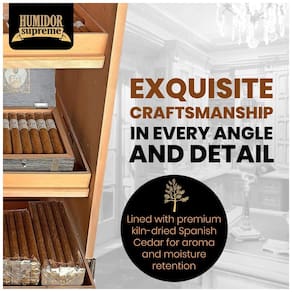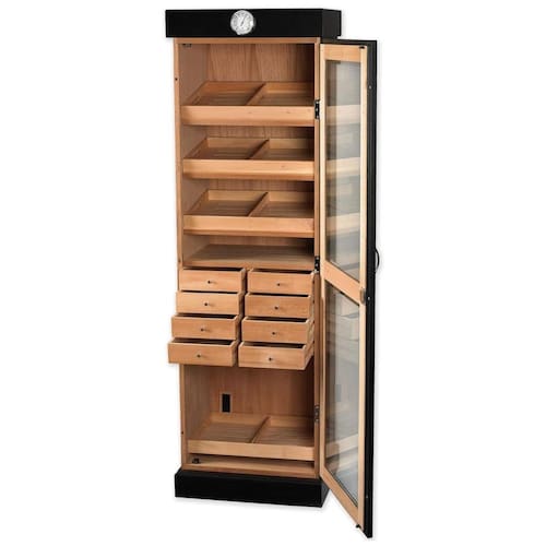 Capacidade Imbatível de Armazenamento: Com capacidade para até 3000 charutos, este umidor de grande capacidade possui 4 prateleiras, sendo 3 ajustáveis, para armazenamento organizado de caixas e 8 gavetas especialmente projetadas para armazenar charutos individuais, garantindo que sua coleção seja preservada de forma impecável.