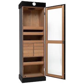 Umidor Móvel: O umidor de torre é projetado com rodas nos cantos, facilitando o transporte. Ele não serve apenas para armazenar charutos; também é uma peça de destaque. Revestido com cedro espanhol premium seco no forno, combina estilo e funcionalidade para garantir que seus charutos sejam armazenados em condições de altíssima qualidade.