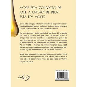 VOCÊ ESTÁ CONVICTO DE QUE A UNÇÃO DE DEUS ESTÁ EM VOCÊ? Caso não, chegou a hora de identificar as possíveis áreas da vida para que os atributos de Deus sejam efetivos com o propósito em te usar poderosamente. De acordo com I João capitulo 2 versículo 27, a unção de Deus é dada a nós por meio do Espírito Santo. É e chegada a hora de identificar os pontos divergentes de sua vida e sará-los por meio da unção e, assim, passar a experimentar das maravilhas do poder do Altíssimo. Ao ler Unção – Vivendo no sobrenatural de Deus, você estará se conectando a princípios que ajudarão a ativar as ações sobrenaturais de Deus em sua vida. Você é um potencial nas mãos de Deus. Acredite! Você está diante de experiencias que talvez você jamais teve, e isso, só será possível por meio da poderosa e infalível unção de Deus.