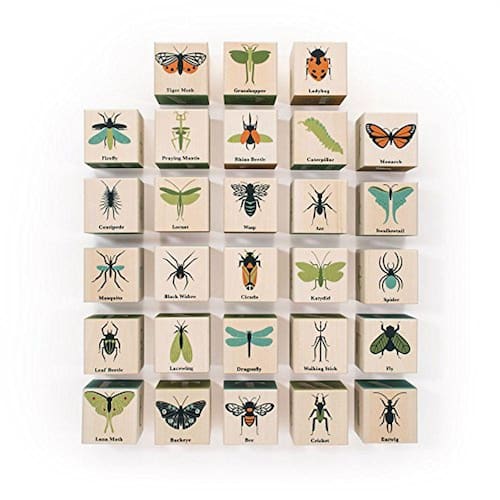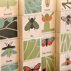 Se você acha que os insetos são feios, dê uma olhada mais de perto. Este conjunto de 28 blocos revela um close detalhado do inseto apresentado em seu lado oposto. Letras coloridas Art Nouveau maiúsculas e minúsculas enfeitam os quatro lados restantes. Explore padrões + etimologia em um conjunto de blocos onde a natureza encontra o design.