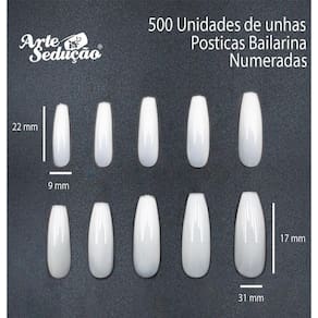 Unhas Postiças de excelente qualidade, possuem ótimo custo benefício. Tendência, as Unhas Bailarina levam esse nome por seu formato se assemelhar ao de uma sapatilha de bailarina, com as pontas afuniladas e lixadas de forma reta.