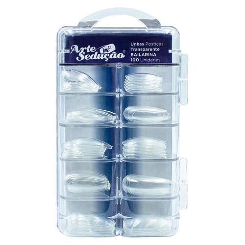 01 - Caixa Acrílica com 100 Unidades de Unhas Postiças Formato Bailarina Transparente, Arte Sedução