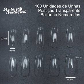 Marca: Arte Sedução Modelo: Bailarina Tipo: Unha Postiça Cor: Transparente Quantidade: 100 Unidades Tamanho: Diversos Composição: Plástico ABS Marca: Arte Seducao