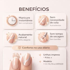 Com um design moderno e a qualidade reconhecida da KISS NEW YORK, as unhas imPress On My Mind IMM29 são ideais para adicionar um toque de personalidade e elegância ao seu visual, garantindo um acabamento profissional e duradouro. Perfeitas para mulheres modernas que não abrem mão de praticidade e beleza, proporcionando unhas perfeitas sem esforço.
