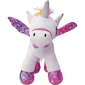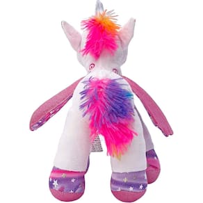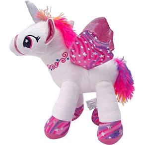 Unicórnio de pelúcia com asas desenhadas bem coloridas, uma verdadeira fofura Detalhes do produto: - pelúcia segura certificada pelo inmetro - detalhes dos olhos e pescoço em bordado - asas super coloridas e lindas - retire todas as etiquetas antes de dar a pelúcia para a criança - peso aprox: 180 gramas